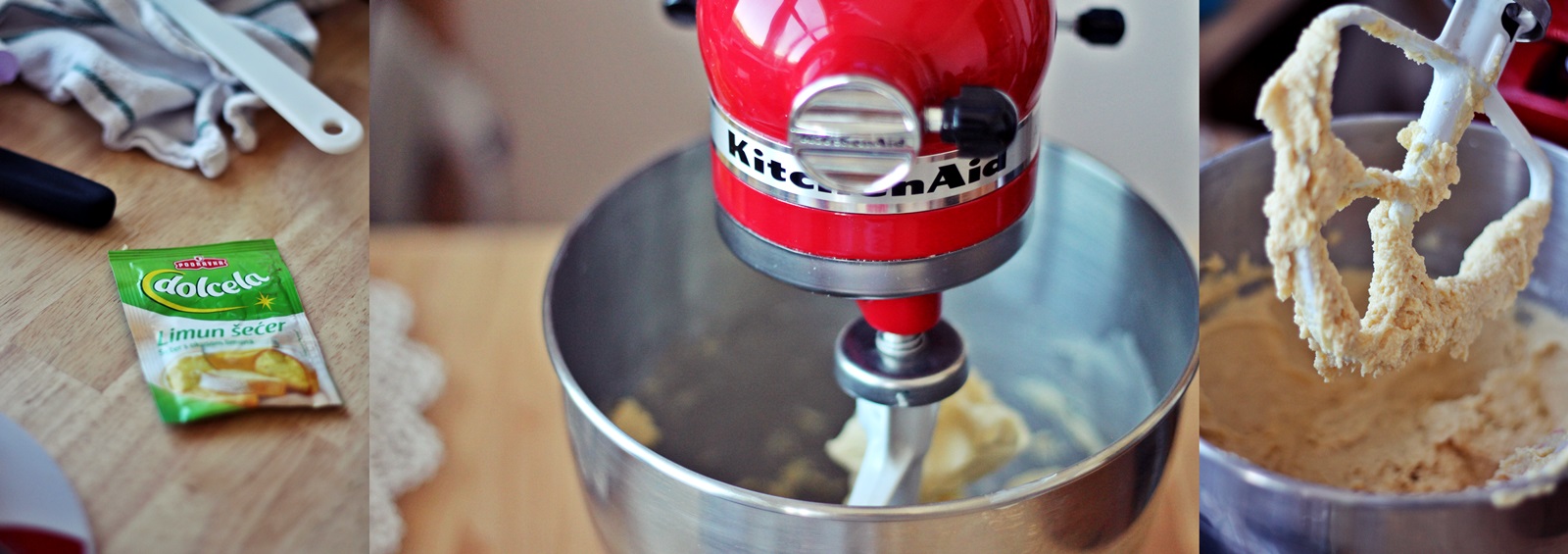 Omekšali maslac miksati oko 2 minute te mu dodati šećer te nastaviti miksati cca 3-4 minute. Kad se lijepo sve spojilo dodati limun šećer te jedno jaje. Nastaviti miksati i dodati još jedno jaje. Dok se jaja miksaju spojiti brašno, sol i prašak za pecivo.