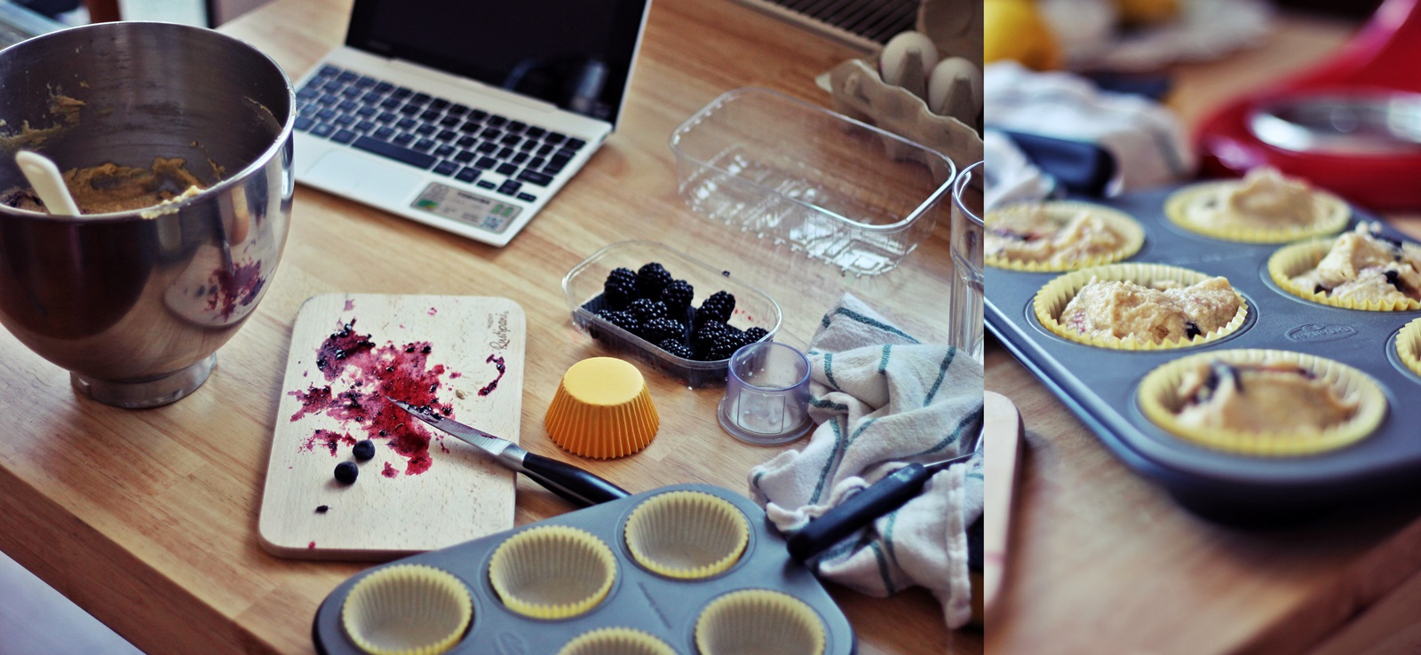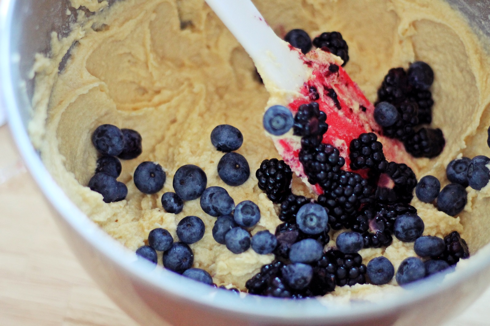 Ručno dodati borovnice i kupine i lagano ih špatulom umiješati u smjesu. Paziti kod miješanja da se borovnice i kupine ne slome pa da smjesa nebude ljubičasta 🙂