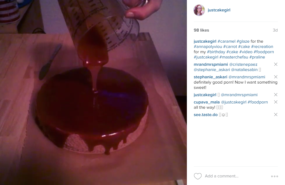Prije nego prelijete tortu budite sigurni da je dovoljno čvrta i da je karamel krema još malo topla da vam bude lakše te maknuti kalup. Još jednom promiješati i preliti karamel preljev po torti počevši od sredite. Ako želite vidjeti kako je video izgledao kod mene svratite na ovaj link na Instagramu.