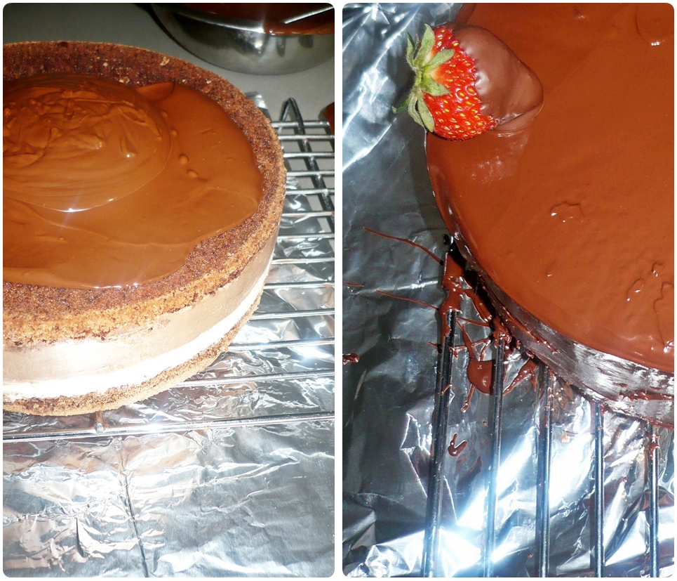 Assembling the cake : remove all the crumbles from the cake and trim it if it is uneven and put it on the platter. Put the mold that it was baked in around the cake and out the white mousse on it and then put it in the fridge. In the meantime make the milk chocolate mousse and put it on the white one. Then put the other cake on the top and leave it in the fridge for a few hours!