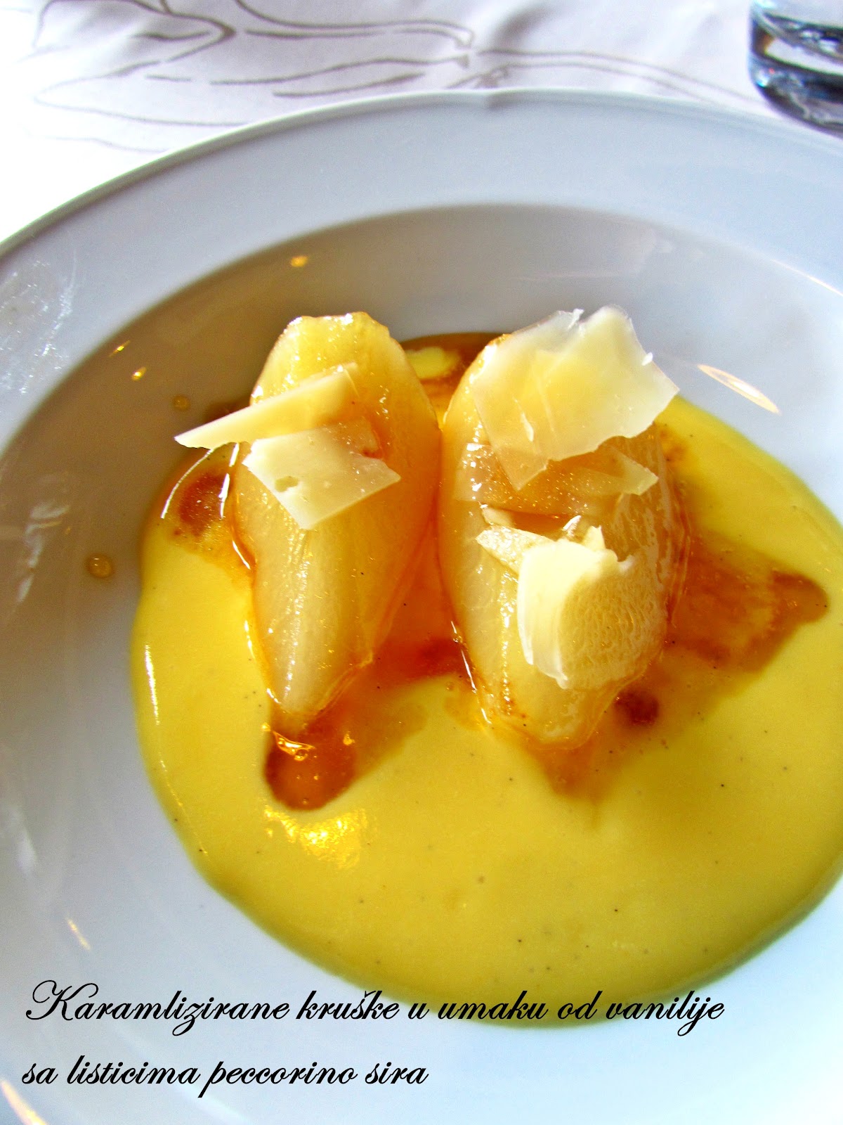 Karamelizirane kruške sa kremom od vanilije i listićima pecorino sira. Definitivno desert dana kako samo cure i ja zaključile. Jedino bi mi izbacile peccorino sir jer nam se čini nepotreban u cijeloj priči. Kruške su bile kuhane do savršenstva te su se topile ustima skupa sa kremom od vanilije koja je bila savršena!
