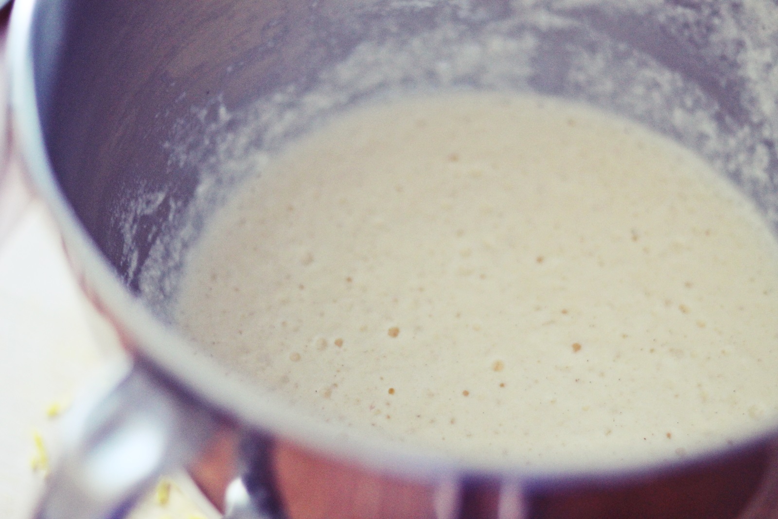 U tu smjesu dodati rastopljeni maslac i koricu limuna te povezati. Nizmjence dodavati brašno i mlijeko te povezati .