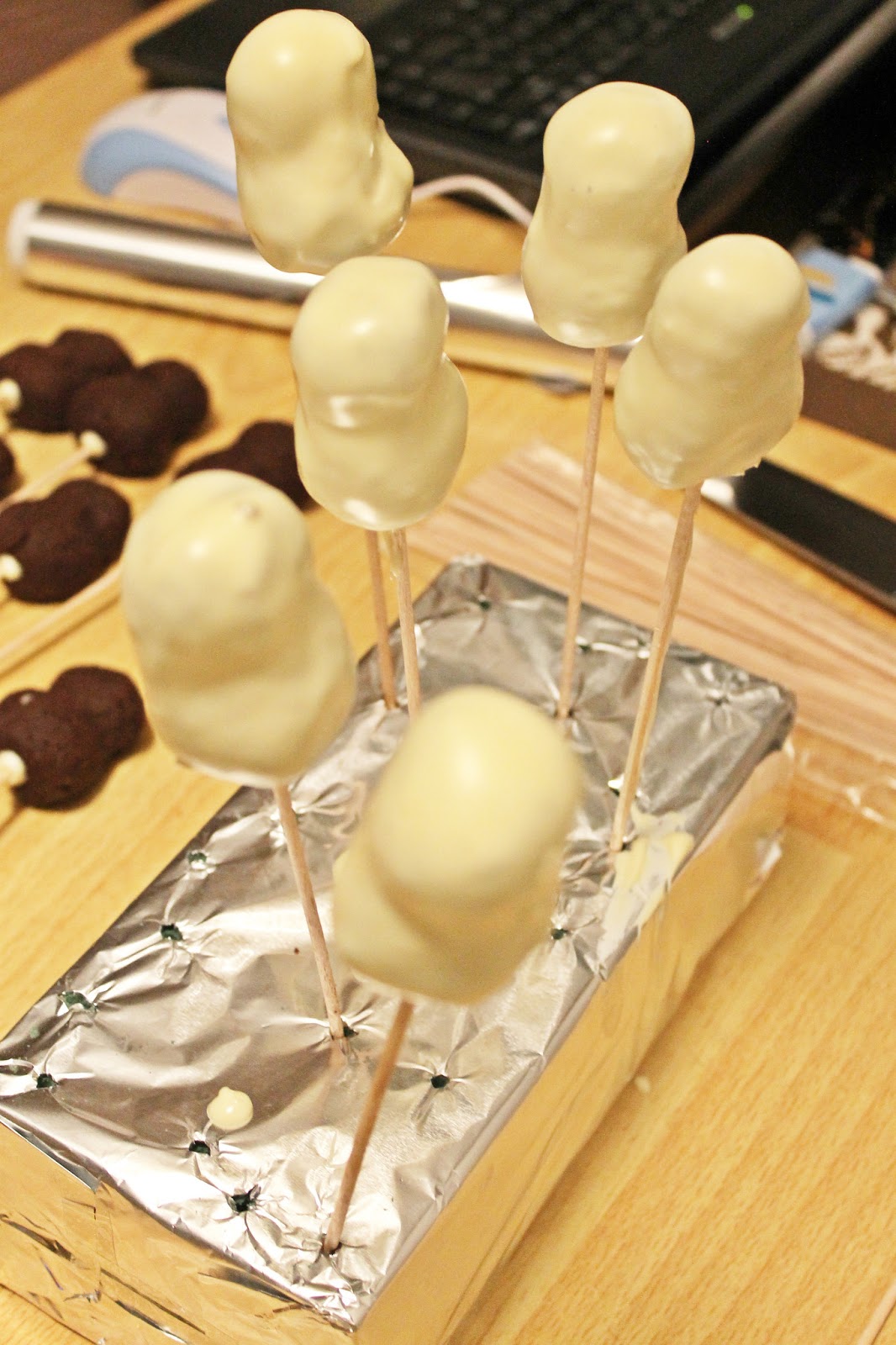 Otopljenu bijelu čokoladu prelijati u šalicu ili neku drugu užu i višu posudu. Svaki cake pop umočiti u čokoladu i ocijediti te zapiknuti u pripremljenu podlogu da se osuši. I tako sa svih 20!