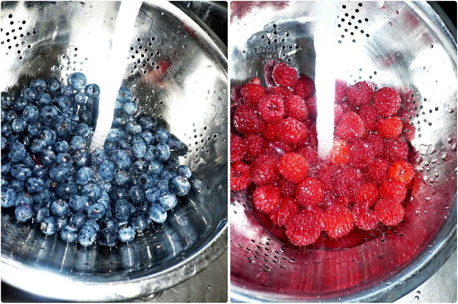Kad se hladi pripremimo voće 🙂 U original receptu su jagode, ali ja sam koristila maline i borovnice 🙂 Maline su domaće a borovnice sa placa 🙂