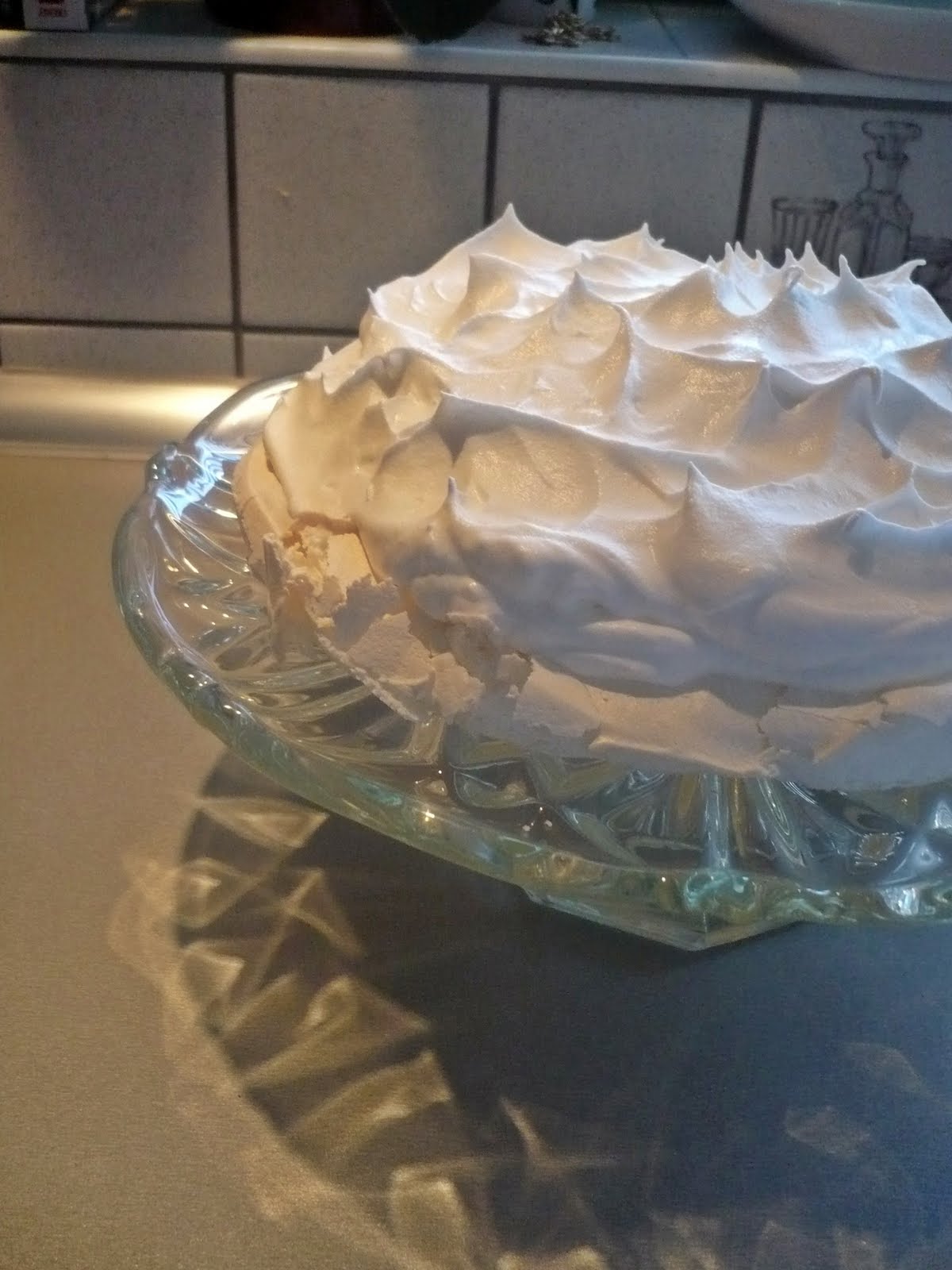 Kad su se bjelanjci miksali ja sam nacrtala krug promjera 20 cm na pek papir uz pomoć svojg kalupa 🙂 I kad su bjelanjci gotovi moraju biti čvrsti da ih se može oblikovati 🙂 Eto fotkice prije pečenja 🙂 Peče se 1 sat i 15 minuta na 150 stupnjeva, nakon toga pećnica se isključi i kora se u toploj širom otvorenoj pećnici suši još 15 minuta.