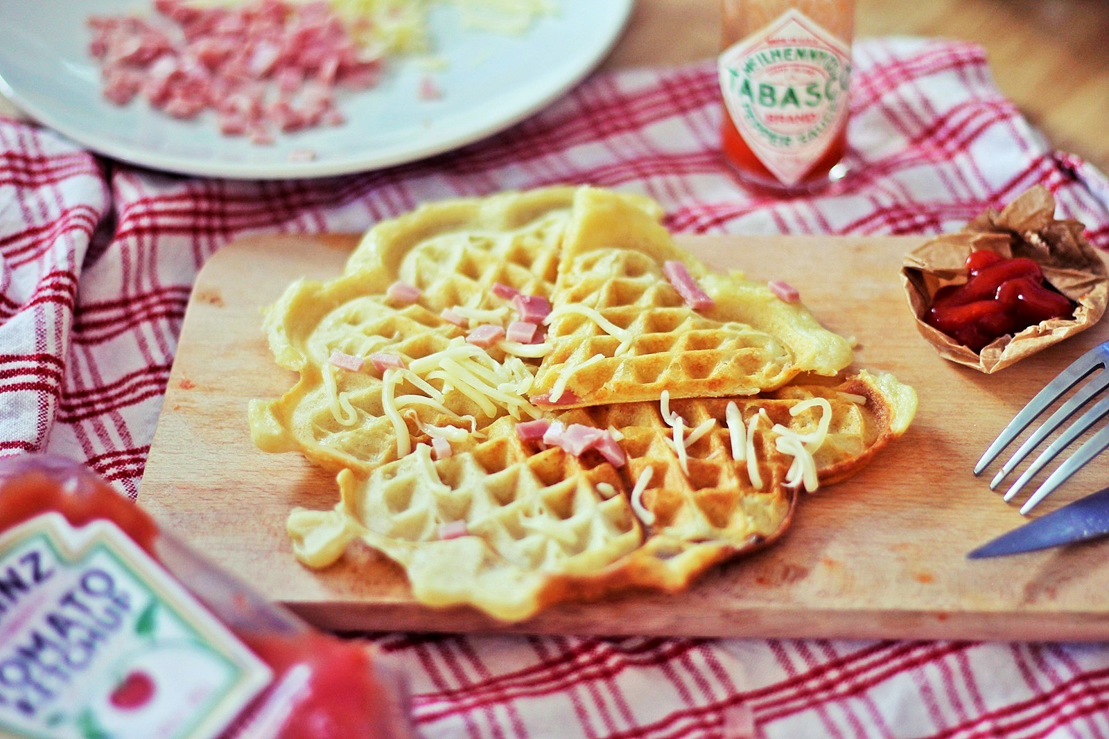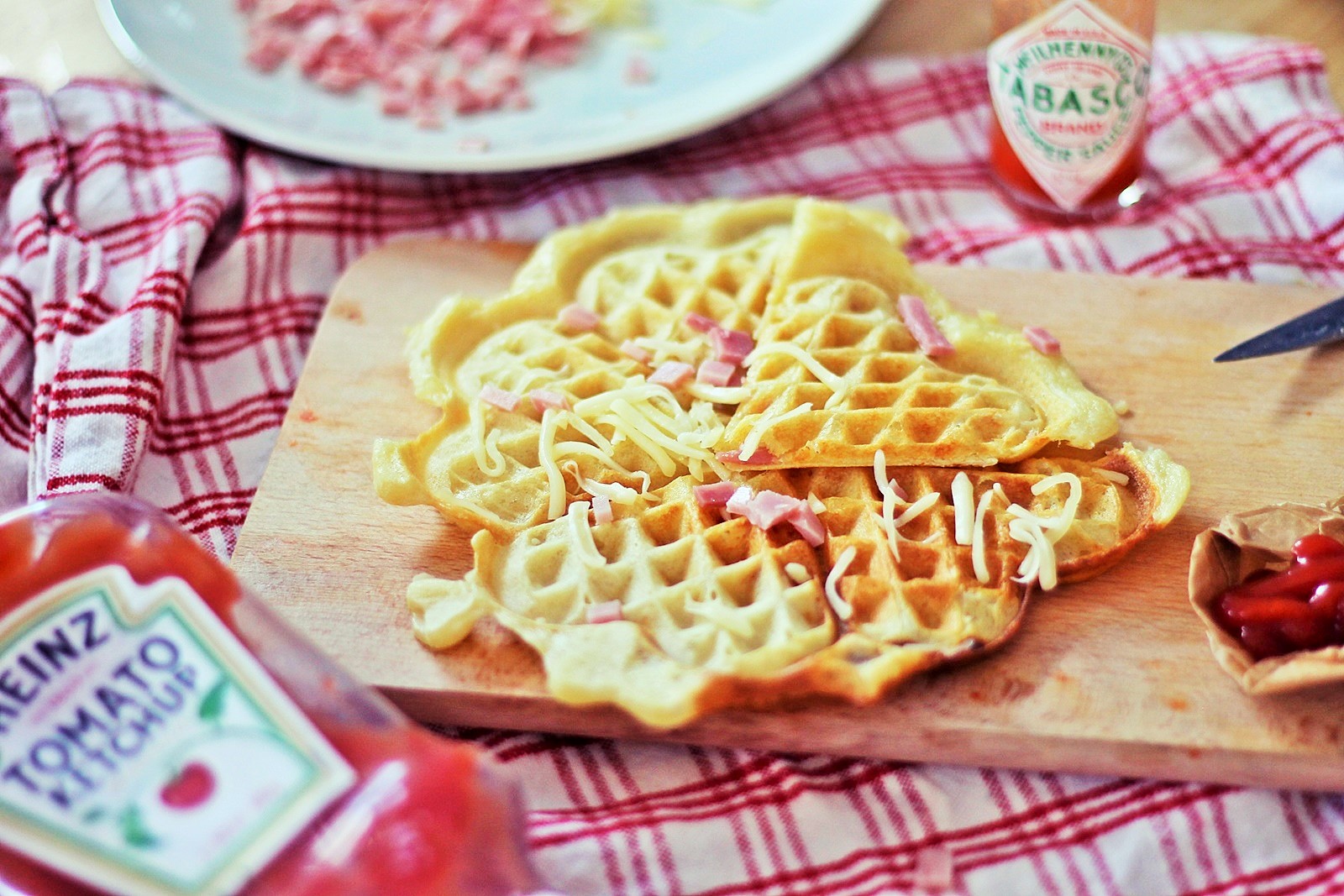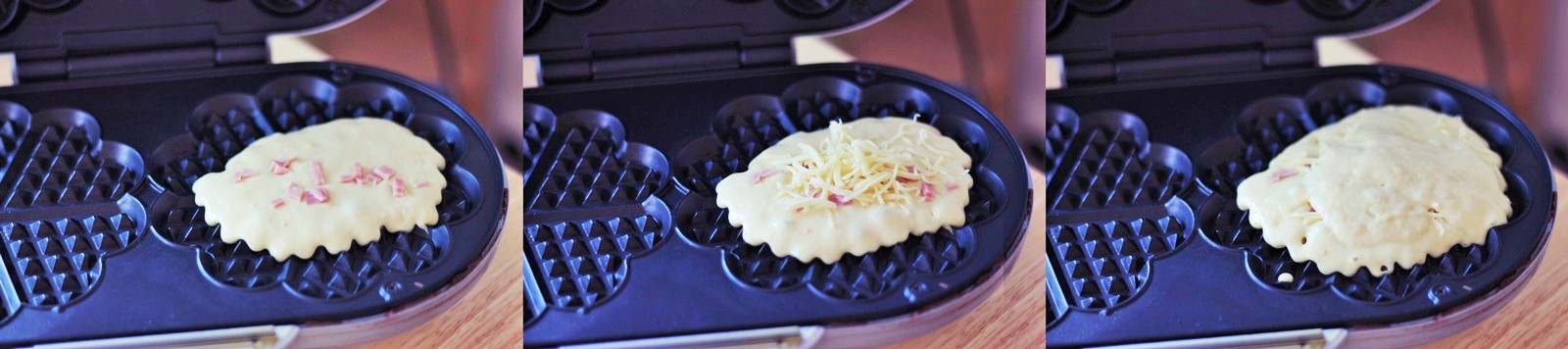 ste stavili u aparat dodajte naribanu šunku i sir te na to dodati još manju količinu smjese da se sve ne zalijepi za aparat. Peći dok ne dobi